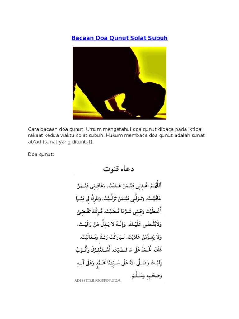Terdapat beberapa pendapat mengenai doa qunut pada saat sholat subuh. Setiap bacaan juga dipermudahkan dengan bantuan audio. Cara mudah hafal doa qunut dalam solat subuh dengan cepat. Membaca doa qunut dalam shalat subuh adalah termasuk sunnah ab'ad menurut madzhab syafii.