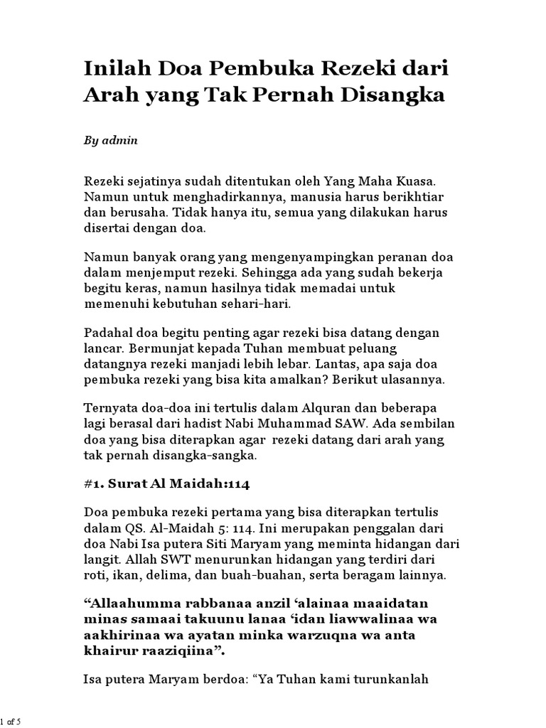 Selain dengan usaha dan amalan, umat muslim bisa mengusahakan membuka pintu rezeki dengan cara berdoa, berikut ini 10 doa pembuka rezeki yang dipanjatkan. Bunyinya, subhanallahi wabihamdihi, subhanallahil 'adzim, astaghfirullah. Berikut ini adalah kumpulan doa mudah, murah dna lancar rezeki yang admin semua tentang rezeki kumpulkan dari berbagai sumber Surat al maidah:114 doa pembuka rezeki pertama yang bisa diterapkan tertulis dalam qs.