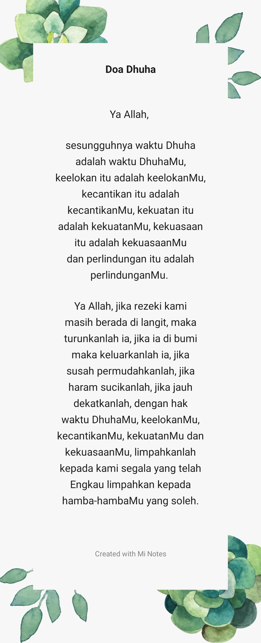 Maksud doa duha diatas adalah seperti berikut Sholat sunnah merupakan ajaran yang diwahyukan oleh allah kepada rasulullah. اَللهُمَّ اِنَّ الضُّحَآءَ ضُحَاءُكَ، وَالْبَهَاءَ بَهَاءُكَ، وَالْجَمَالَ جَمَالُكَ، وَالْقُوَّةَ قُوَّتُكَ، وَالْقُدْرَةَ قُدْرَتُكَ، وَالْعِصْمَةَ عِصْمَتُكَ. Setelah selesai sholat dhuha disunahkan untuk melaksanakan dzikir dan doa untuk lebih mendekatkan diri kepada allah swt.