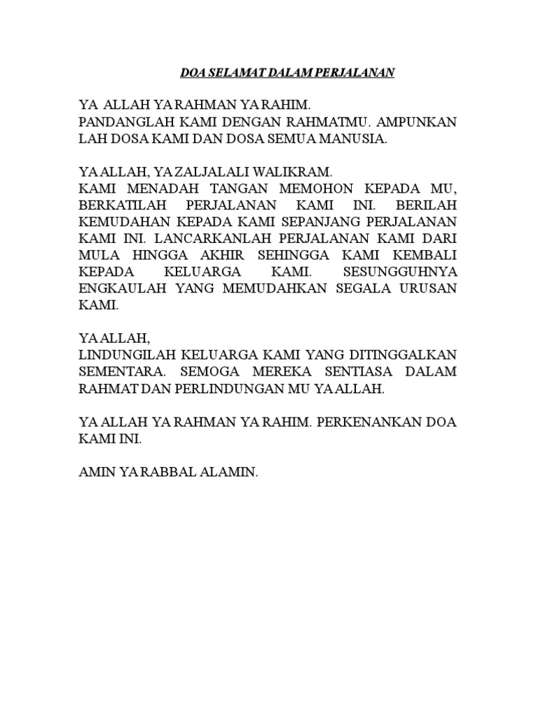 Doa Perjalanan from imgv2-2-f.scribdassets.com Doa ketika membasuh kaki kanan. Sudilah menjadi bagi kami penghibur dalam segala perjalanan tempat bernaung di waktu panas terik, tempat berteduh di kala hujan kabulkanlah doa kami, dengan perantaraan kristus tuhan kami. Umat islam jika singgah di satu tempat, apa yang harus.
