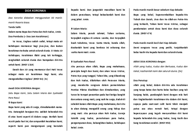 Kartu Doa Koronka Pdf from imgv2-1-f.scribdassets.com Amalan doa agar dia ingat ini sudah banyak miss rahma berikan pada klien beliau sebelumnya dan banyak dari mereka yang merasa puas dan berhasil mendapatkan manfaat energi pengasihannya. Doa koronka / kerahiman diajarkan tuhan yesus sendiri pada penampakan tahun 1935 kepada suster faustina. Cara berdoa koronka kepada kerahiman ilahi koronka ialah doa yang disampaikan tuhan yesus kepada santa faustina.